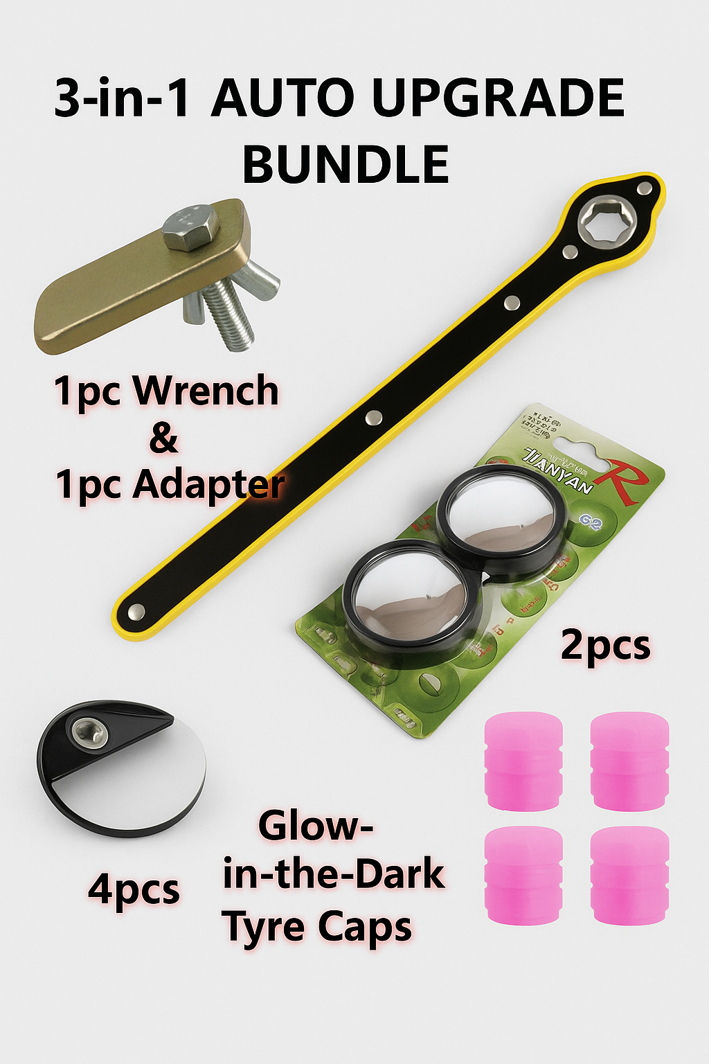 Jack Ratchet Wrench Spanner + 360° Blind Spot Mirror + Glow-in-the-Dark Tyre Caps